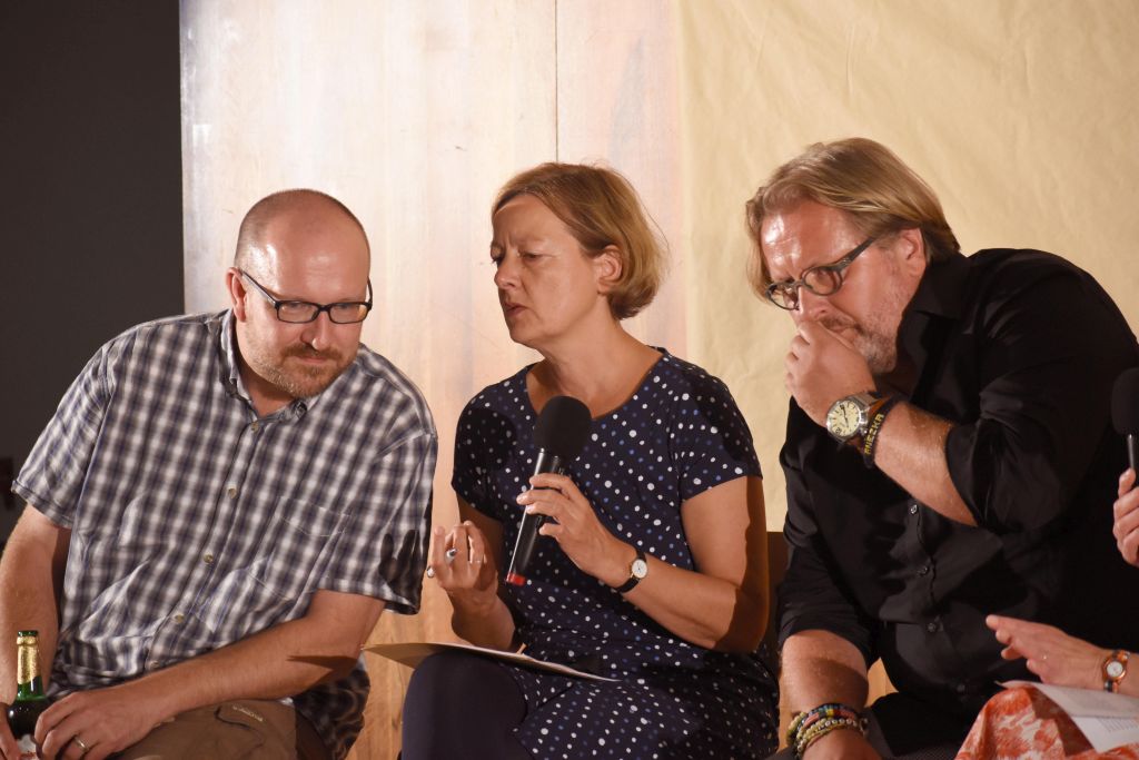 Následná pódiová diskuze autorů s publikem otevřela bolavá místa české a česko-německé historie – od tzv. „divokého odsunu“ sudetských Němců, který tematizuje Levínského hra, přes nechvalnou éru masového dopingu českého socialistického sportu ve hře Davida Drábka až k dnešním skandálům české politické scény, kterých ve své hře groteskně využívá Roman Sikora.